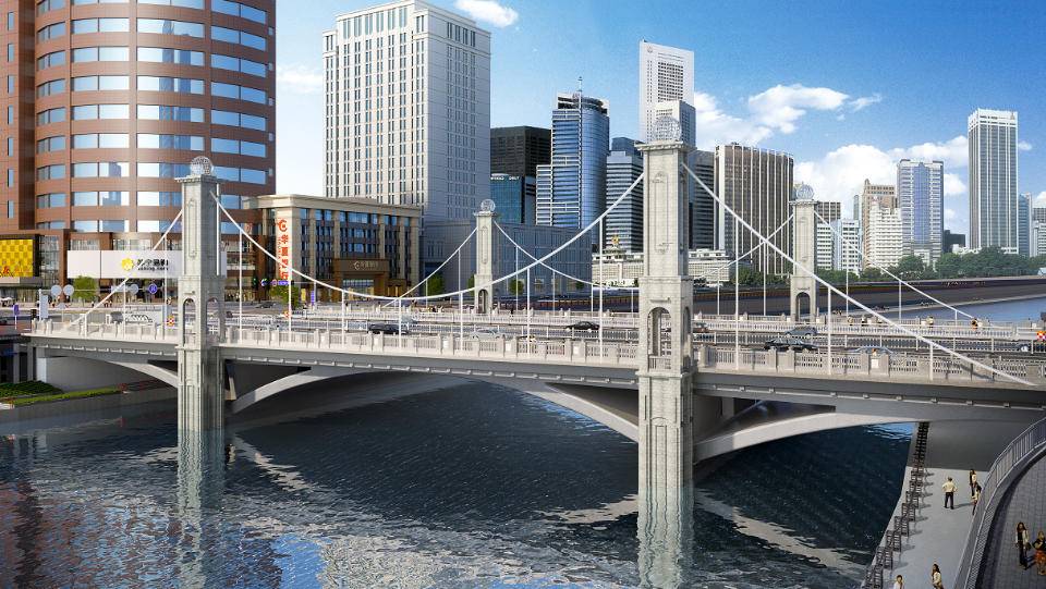 设计方案确定后,潍坊市城市管理局以线上视频研讨会等形式,加快施工设计研究,对桥梁主要技术参数、交通组织、夜景亮化、桥头景观等细节反复研讨。新建桥梁全长102米、宽53米,为28+46+28米梁拱组合桥,桥梁横断面为4.2米人行道+44.6米主路+4.2米人行道。